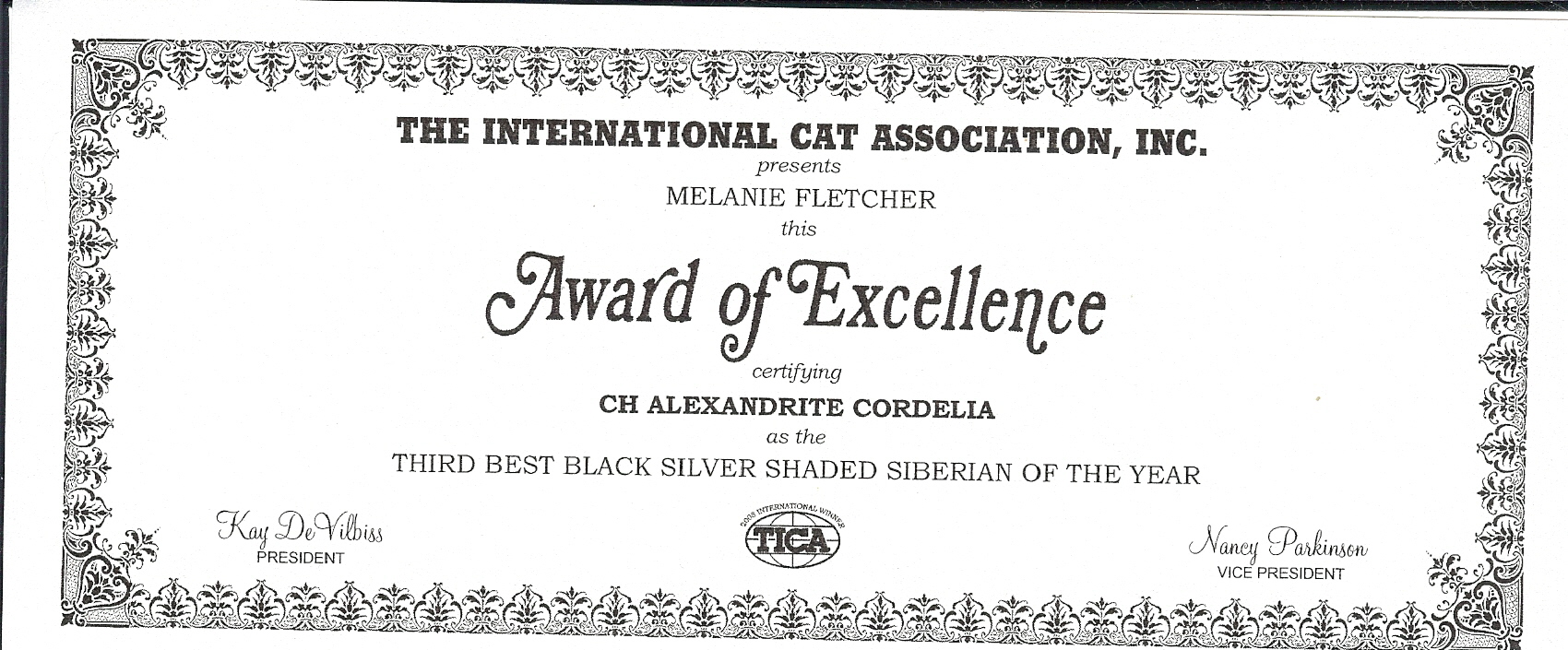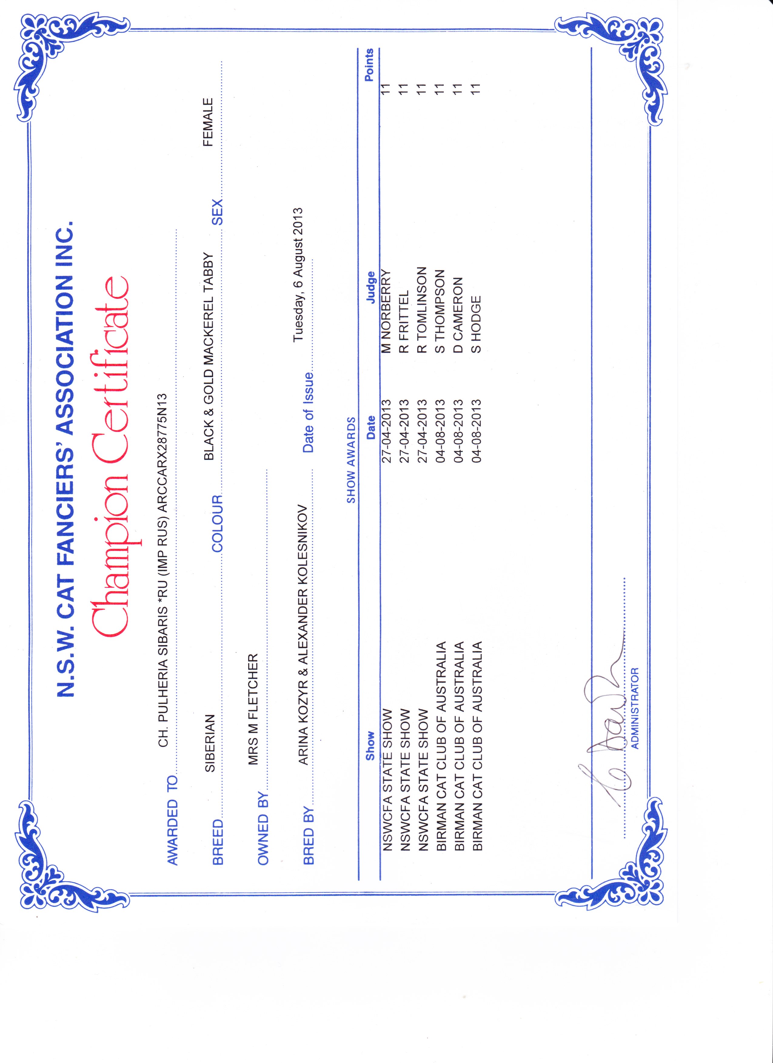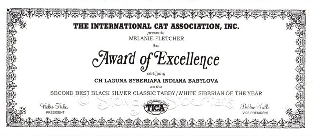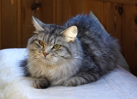 Georgia came to us from Maria Bunina of Musrafy Siberians and like all Maria's kittens, has an excellent pedigree of 100% Russian relatives. A big thank you to Maria for introducing us to the Siberian cat breed and letting Georgie join our family.
