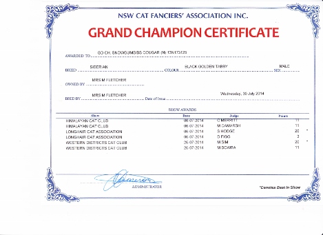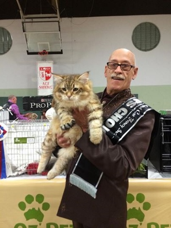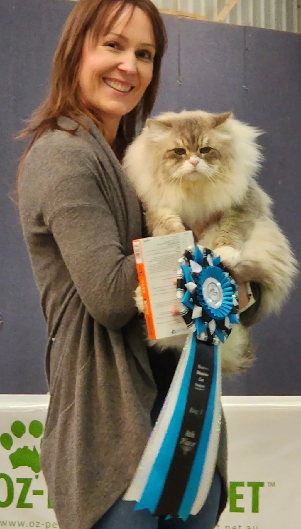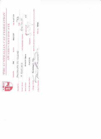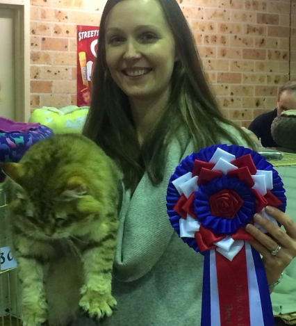 Cougar has stolen the show on a number of occasions, winning the Purina Exhibitor's Choice Award and the NZ Cat Fanciers Association Judges Choice award as well as Best Group1 Adult at the ACF National Show (his first show) in June 2014. He then went on to win Supreme Exhibit at the Western Districts and Long Hair Cat Club CFA shows, and then Group 1 Best in Show at the NSW CFA Fundraising show. Cougar was awarded NSW CFA 5th Best Group 1 Cat of the year and the title of Double Grand Champion by attending just 3 CFA shows! Well done Cougs! You are a super star!