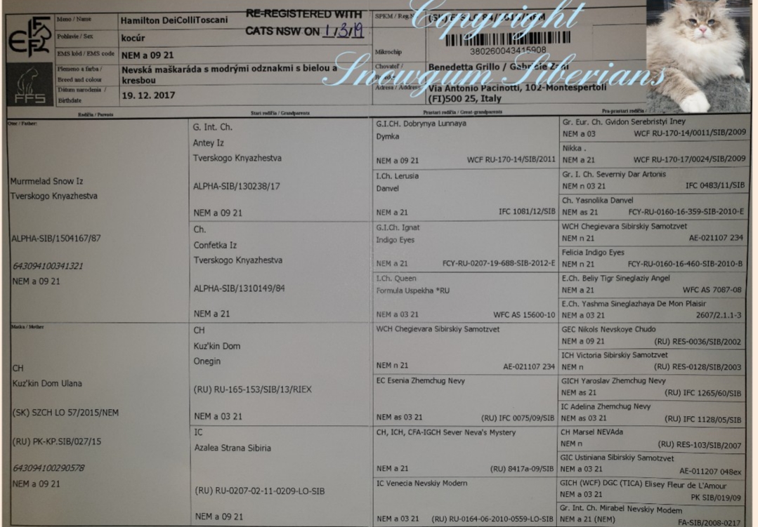 GCH Hamilton Dei Colli Toscani, known as "Hamilton" at home, is a huge, beautiful blue tabby point and white Neva Masquerade (blue-eyed Siberian), all the way from Italy! Thank you Benedetta Grillo for allowing this sweet, handsome boy to join our breeding program.