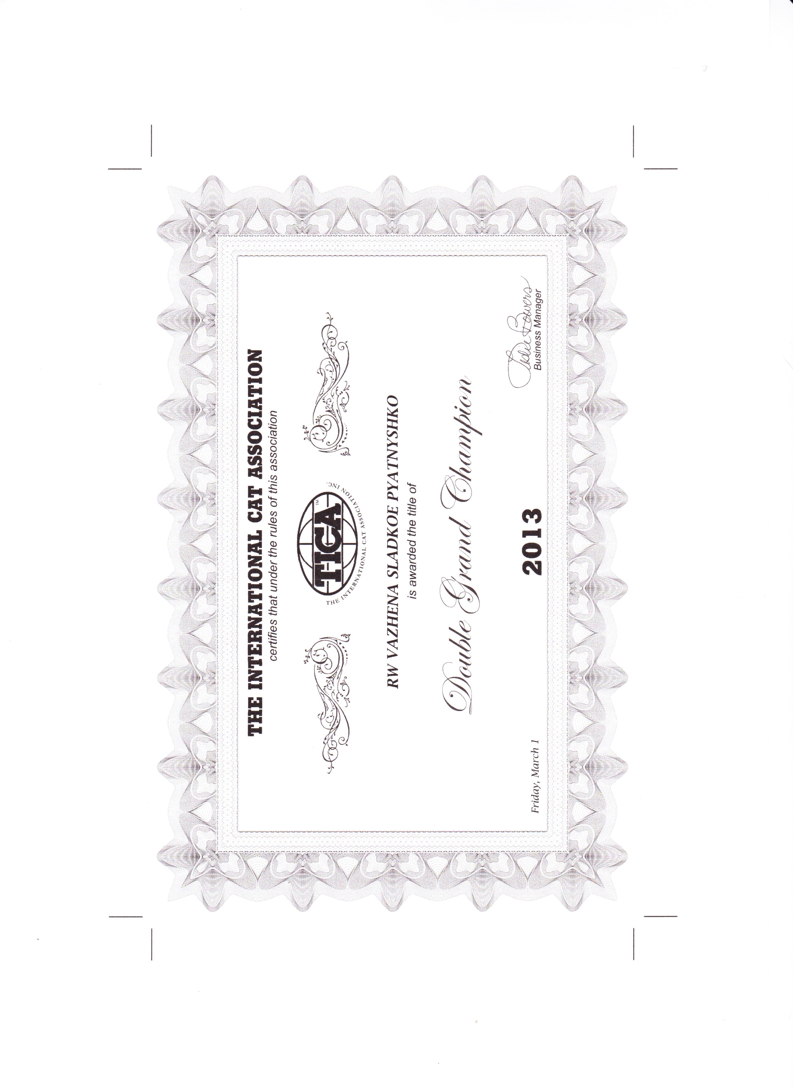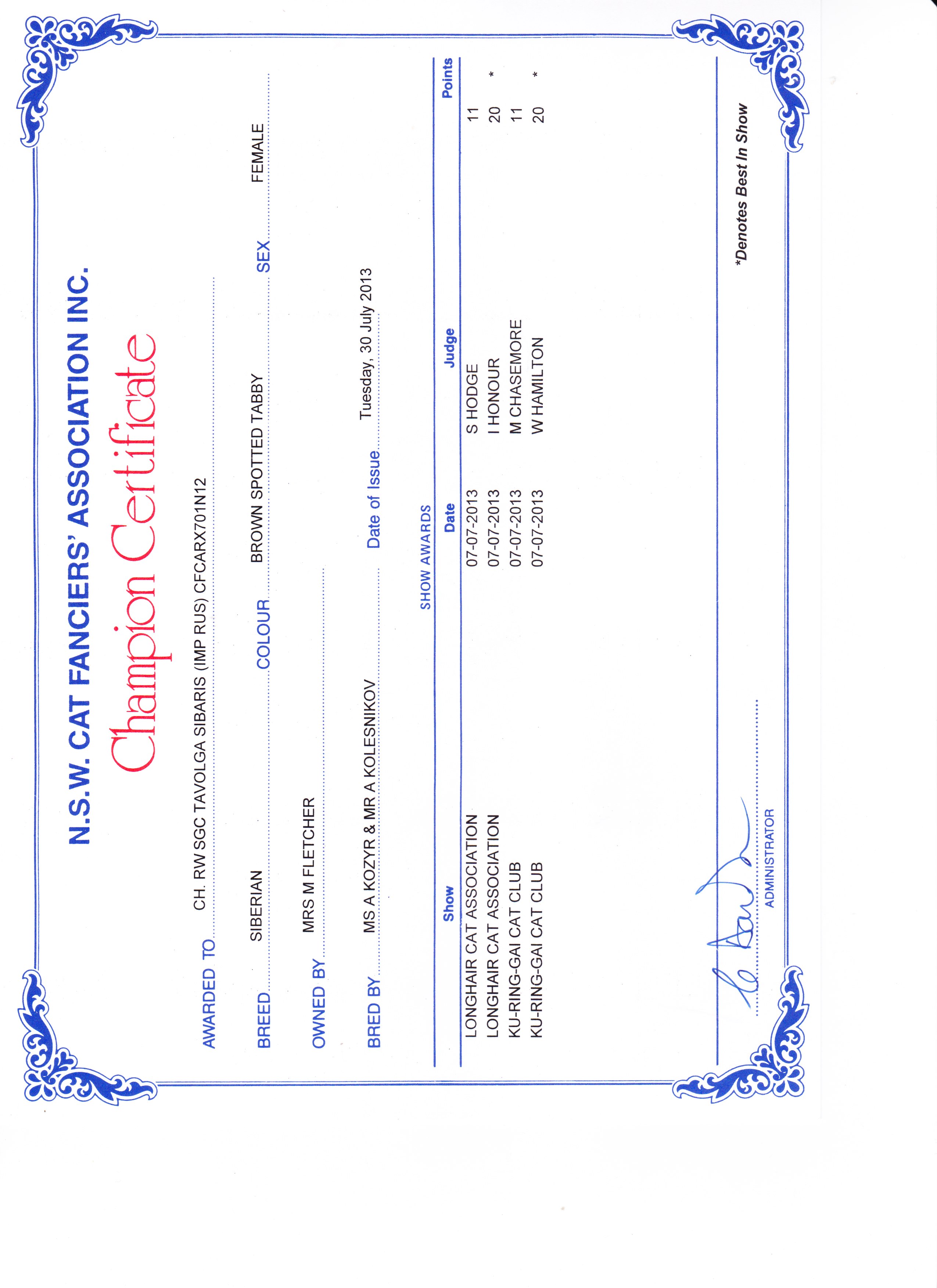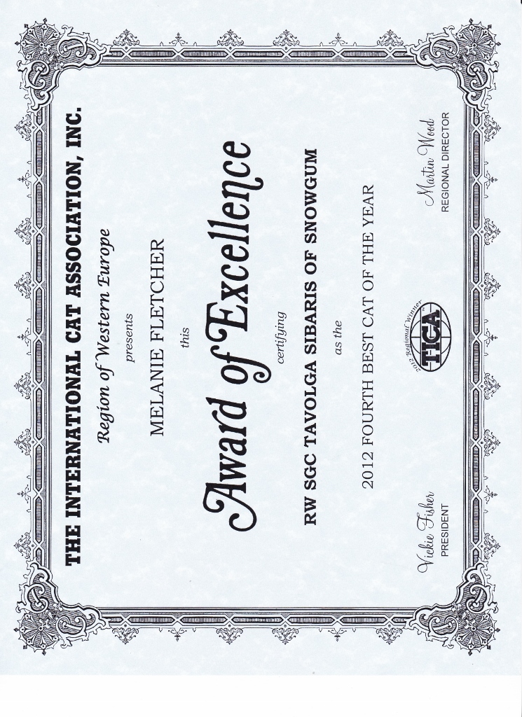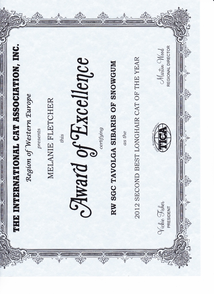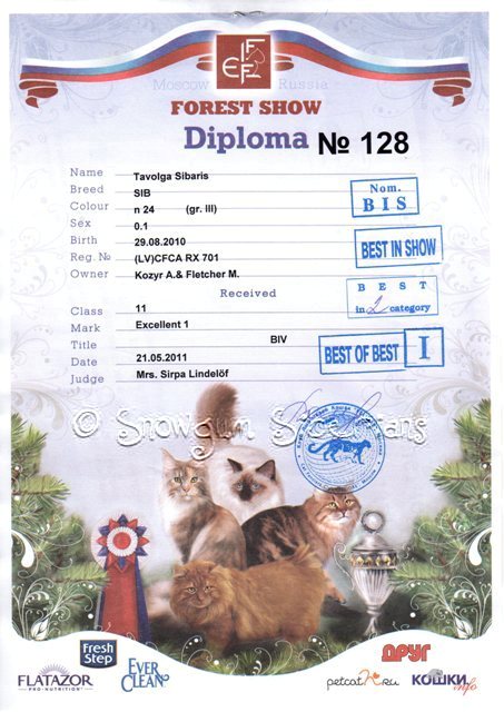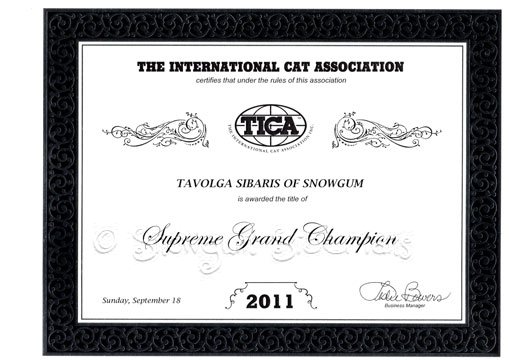 Meadow has quickly followed in her mother's footsteps to also achieve great show results. She started her show career incredibly well- we went to Moscow to show her in the FIFe Felidae Forest Show in May 2011 and not only did she win Best Kitten in Show but she went on to beat all the neuters and adults to win overall Best of Best! Amazing stuff! We are so proud! Following that, she wowed the judges in the UK to achieve the top title in TICA of Supreme Grand Champion in just three shows at the tender age of 12 months! There are very few SGC female Siberians in the world so we are thrilled our Meadow is one of them! Meadow we are so proud of you baby girl! Meadow went on futher to win the title of Regional Winner and second best Siberian Cat in TICA that show season.