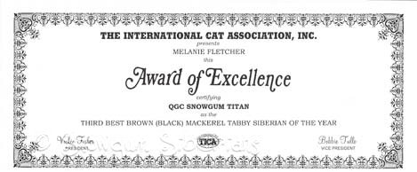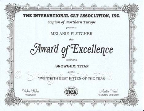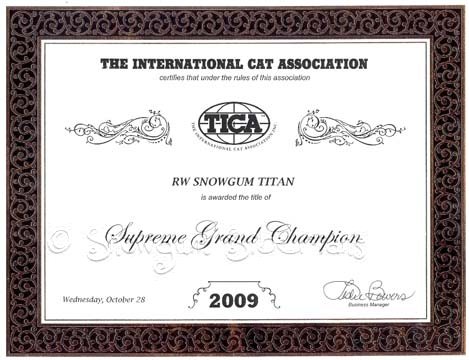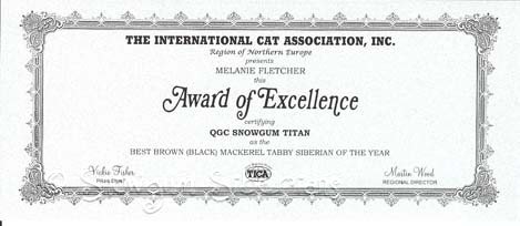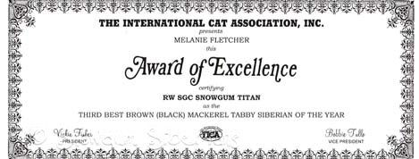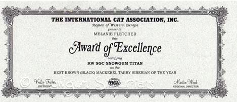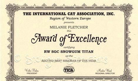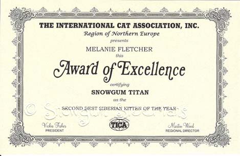 As featured in "The Cat Collection" magazine with his own replica plush toy, Snowgum Titan, or "Mr T", is a very handsome brown mackerel tabby Siberian. He has had a brilliant show career being awarded Best Kitten 10 times and making 17 other finals all in just 6 days of showing him as a kitten! This earned him the title of Regional Winner for the region of Northen Europe! Upon graduating to the adult class, Titan quickly accumulated his titles. He earned the title of TICA Quadruple Grand Champion at just 10 months of age! He then went on to achieve the ultimate TICA title of Supreme Grand Champion by just 18 months of age! Titan was then awarded a second Regional Win as an adult in the 2009-2010 show year! We are so proud of him :-)